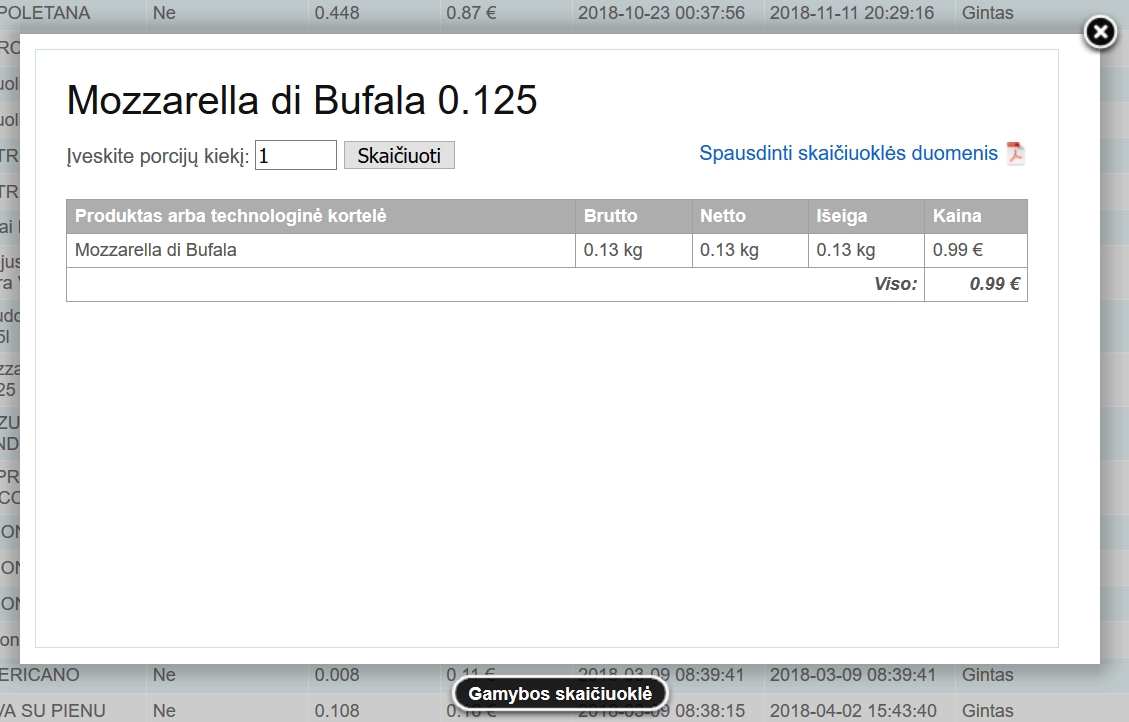 (2 nr) pažymėtas mygtukas iškviečia skaičiuoklę, kurios pagalba galite sužinoti kiek ir kokių produktų bus sunaudota norint pagaminti įvestą kiekį patiekalų (2 pav).