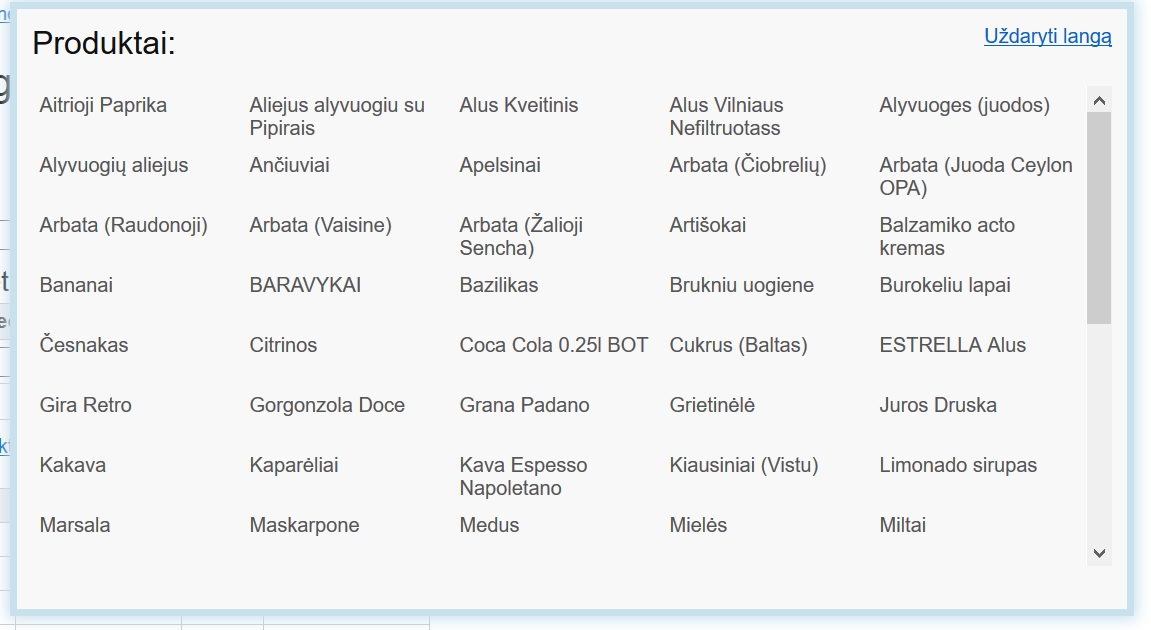 (5 nr) pažymėtas mygtukas, kurį paspaudus iššokančiame lange bus atvaizduojamas visų sandėlio produktų sąrašas (6 pav). Pusgaminio atveju vietoj obuoliuko bus atvaizduojama sąrašo ikonėlė. Ją paspaudus iššoks langas su visų pusgaminių kortelių sąrašu. Iššokusiame lange tereikia paspausti ant reikiamo produkto arba pusgaminio ir jis automatiškai bus įkeltas į technologinės kortelės sudėtį.