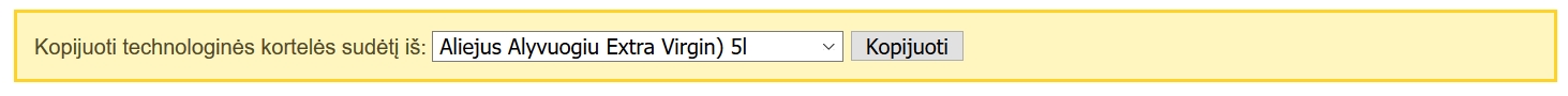 Kuriant naują patiekalo arba pusgaminio technologinę kortelę formos viršuje yra pateikiama kortelių kopijavimo galimybė (4 pav). Pasirinkus reikiamą kortelę ir paspaudus mygtuką "Kopijuoti" jos turinys su visais produktais ir jų kiekiais bus automatiškai perkeltas į naująją technologinę kortelę.
