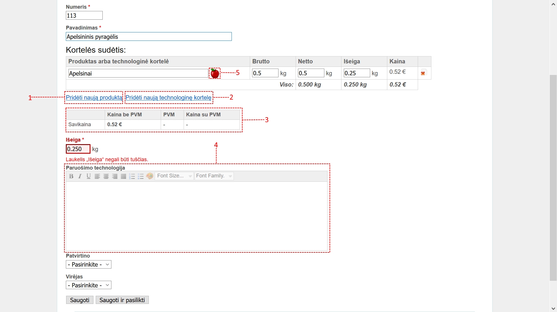 Kortelės sudėtyje pridėjus naują produkto arba pusgaminio technologinės kortelės eilutę, vedant pavadinimą svarbu produktą / pusgaminį išsirinkti iš po laukeliu iškrentančio pasirinkimų sąrašo. Kitu atveju eilutė bus užpildyta netinkamai. Išsirinkti reikiamą produktą arba pusgaminį galite ir šalia laukelio esančio (5 nr) pažymėto mygtuko pagalba.