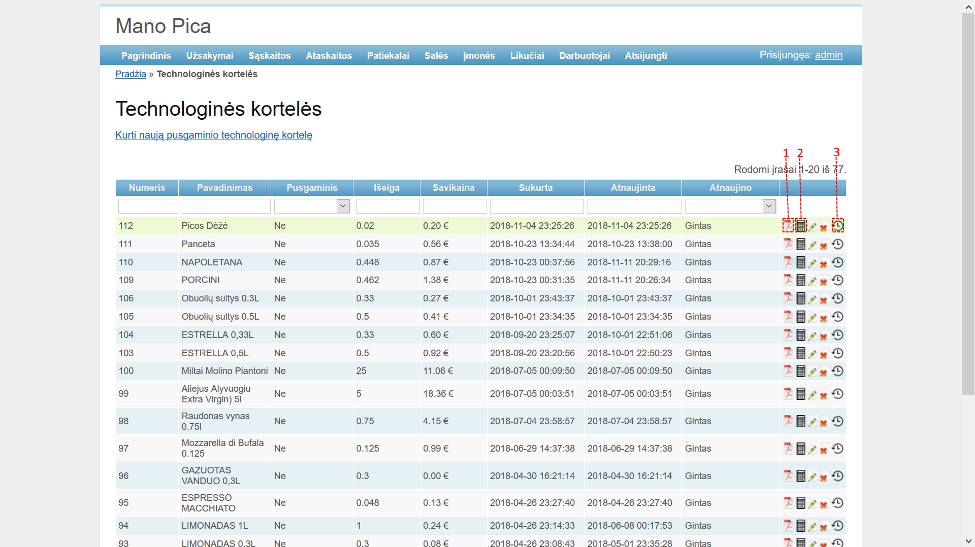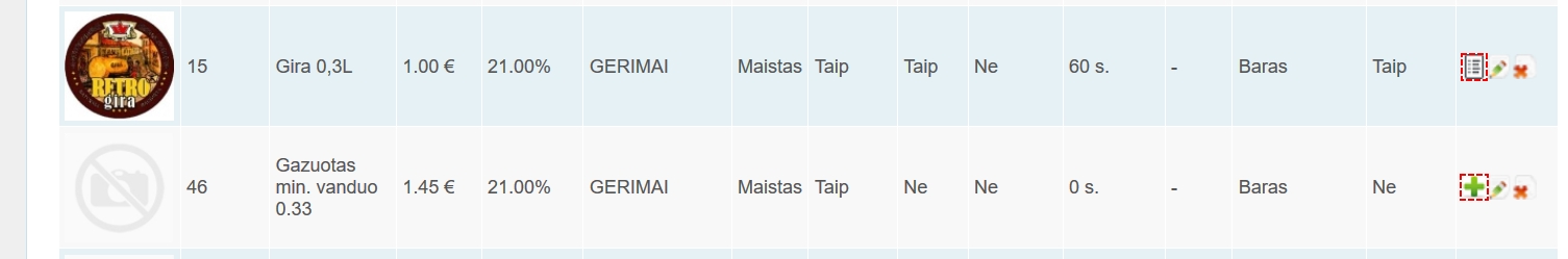 Patiekalų technologines korteles galite kurti tik patiekalų valdymo puslapyje. Patiekalai, kuriems reikia sukurti technologinę kortelę, turi mygtuką su žaliu pliusiuku, na o patiekalai jau turintys technologines korteles turi mygtuką su popieriaus lapu (3 pav).